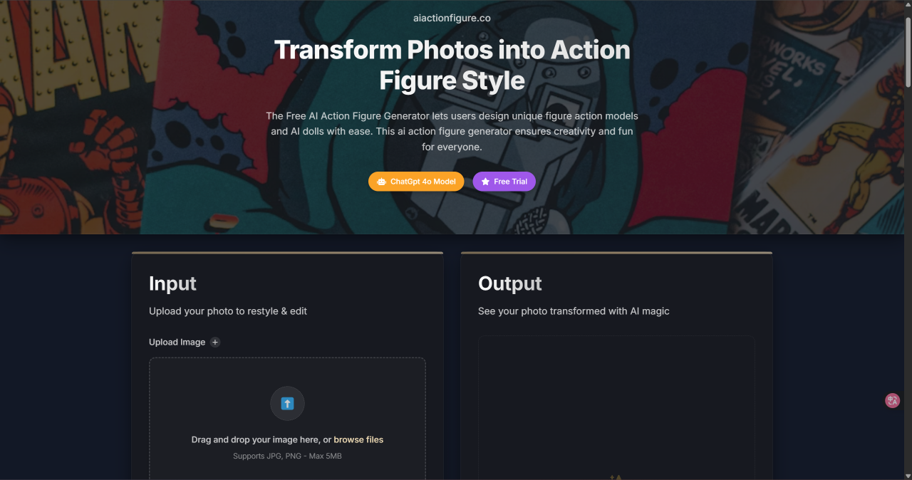 AI Action Figure Maker is a creative tool powered by artificial intelligence that lets you design custom action figures effortlessly. Upload a photo or provide a description, and the AI instantly generates a lifelike 3D model. You can personalize your figure’s pose, outfit, and style to match your vision. Ideal for collectors, artists, and fans, this tool turns imagination into realistic digital or physical collectibles with ease.