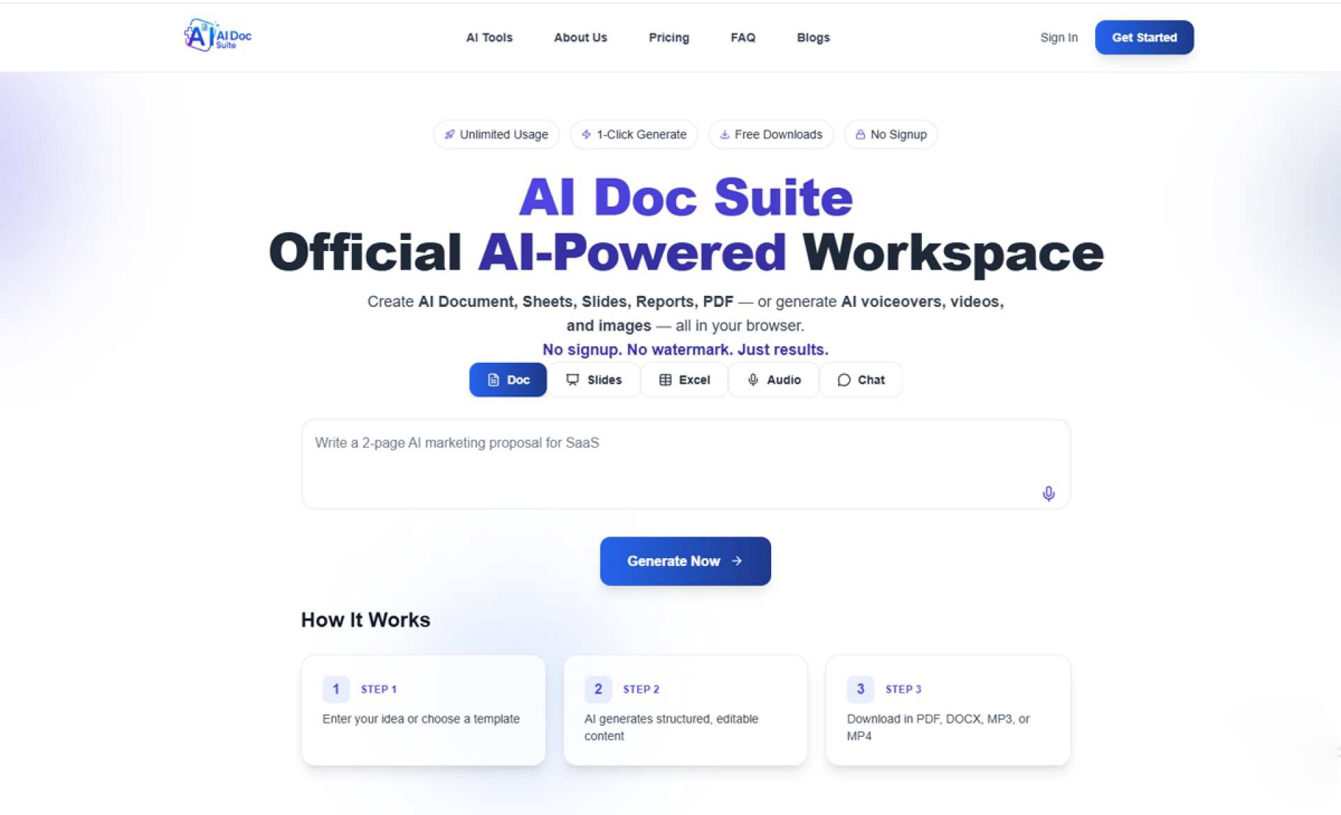 AI Doc Suite / AI Document Suite is a next-generation, all-in-one AI-powered workspace that allows users to create, edit, and convert documents, slides, spreadsheets, images, audio, and video — all within a single browser-based platform.
