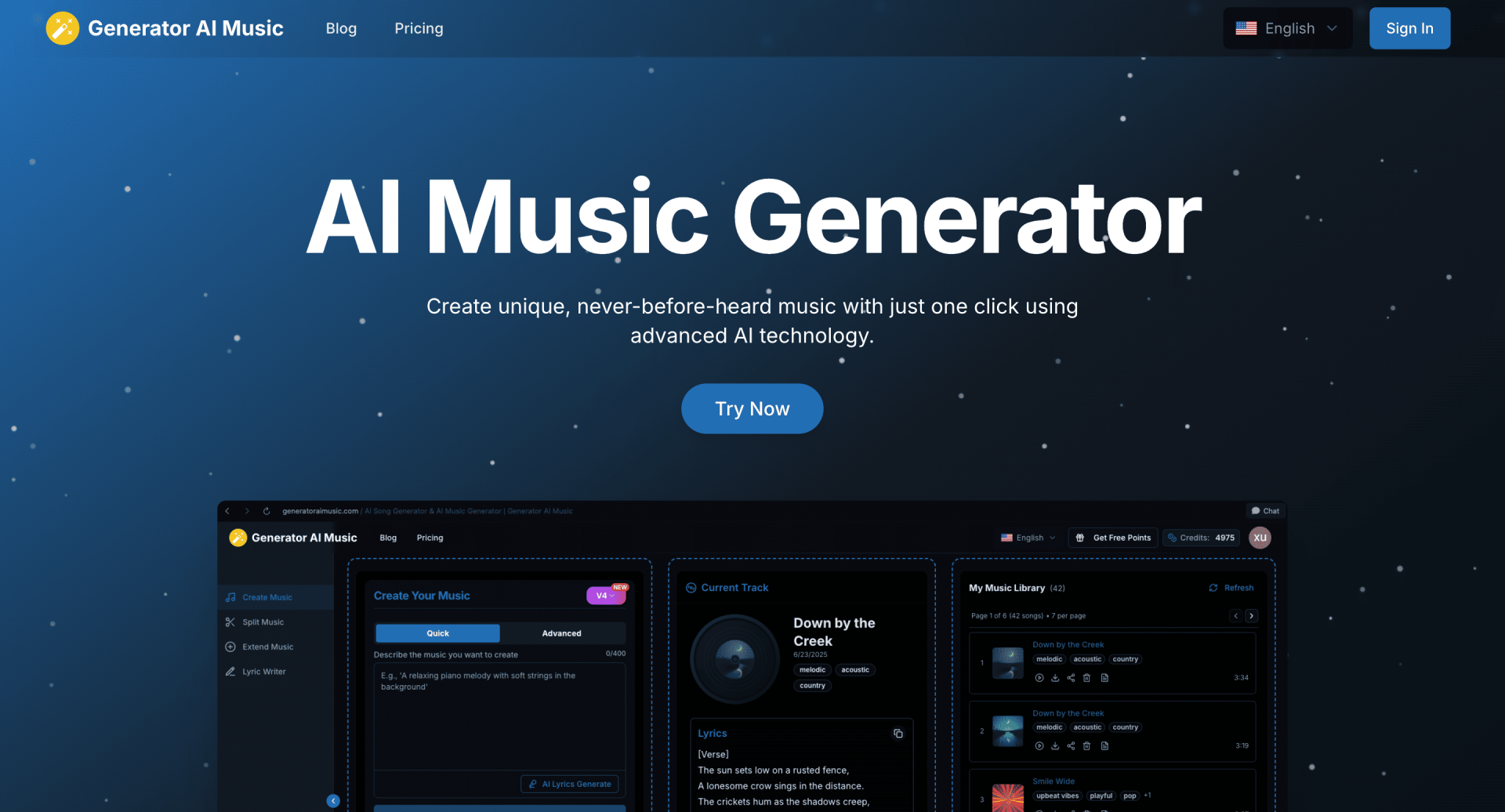 Generator AI Music helps creators generate original, royalty-free background music quickly for videos, ads, podcasts, and social content. Describe the mood, genre, tempo, and instruments you want, then generate tracks you can download and use in your projects. It’s built for speed and simplicity—ideal for content teams and solo creators who need fresh audio without searching stock libraries (usage rights depend on the plan/terms).