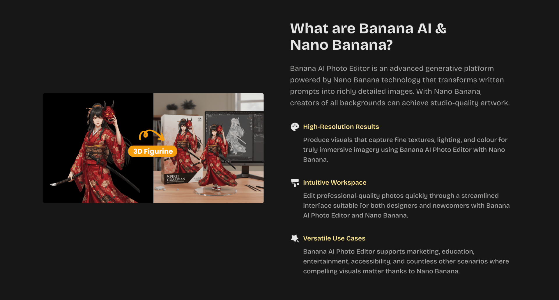 Banana AI Photo Editor is an advanced generative platform powered by Nano Banana technology that transforms written prompts into richly detailed images. With Nano Banana, creators of all backgrounds can achieve studio-quality artwork.