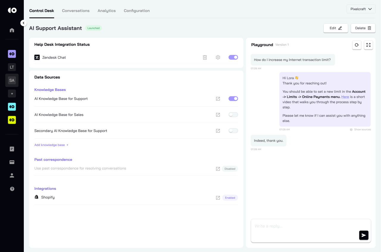 A unified command center for managing every aspect of AI-powered customer support. Integrations, knowledge sources, AI performance, and automation rules are instantly accessible in one place. Teams can launch or pause the AI Assistant, connect help desk systems such as Zendesk, sync customer data, and monitor how accurately the AI handles real conversations. Everything is visual, controlled with toggles, and designed for seamless oversight — enabling fast deployment and continuous optimization without engineering effort.