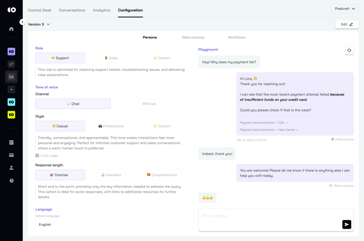 A fully customizable behavioral profile that defines how the AI interacts with customers. Support role optimization ensures reliable troubleshooting, guidance, and helpful replies. Tone-of-voice controls refine personality parameters — casual and warm for chat, or business-professional for email. Emojis, response length, and writing style are adjustable to match brand voice standards. Businesses create a digital agent that sounds like their real team: friendly, concise, and always on-brand, across all communication channels.
