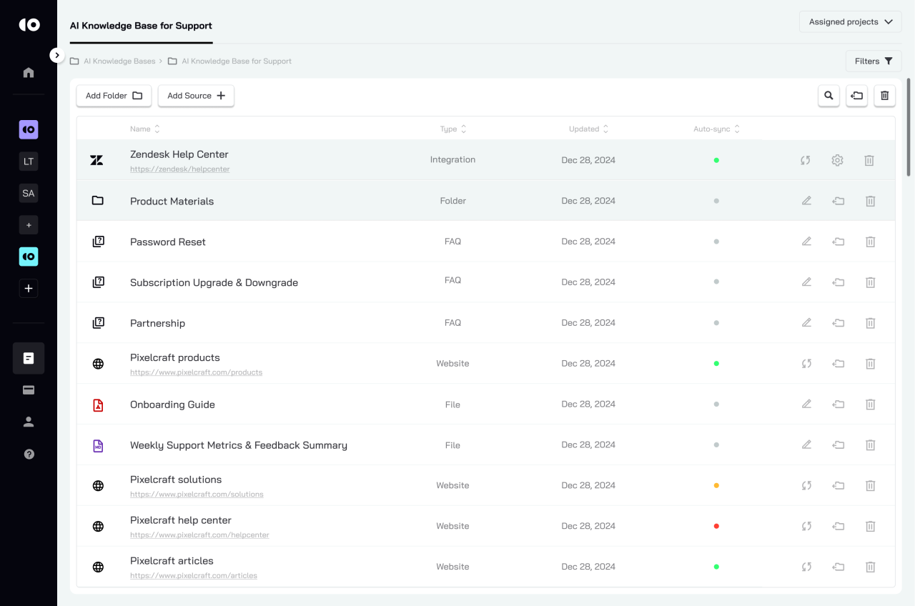 A powerful knowledge ingestion system that automatically syncs support documentation from multiple locations: help centers, website pages, internal files, onboarding guides, product manuals, and even past customer conversations. Every source is categorized and tracked with version control, update timestamps, and auto-sync indicators to guarantee the AI always works with the latest verified information. Data imports happen with a single click — no reformatting required — enabling instant training and continuous knowledge growth.