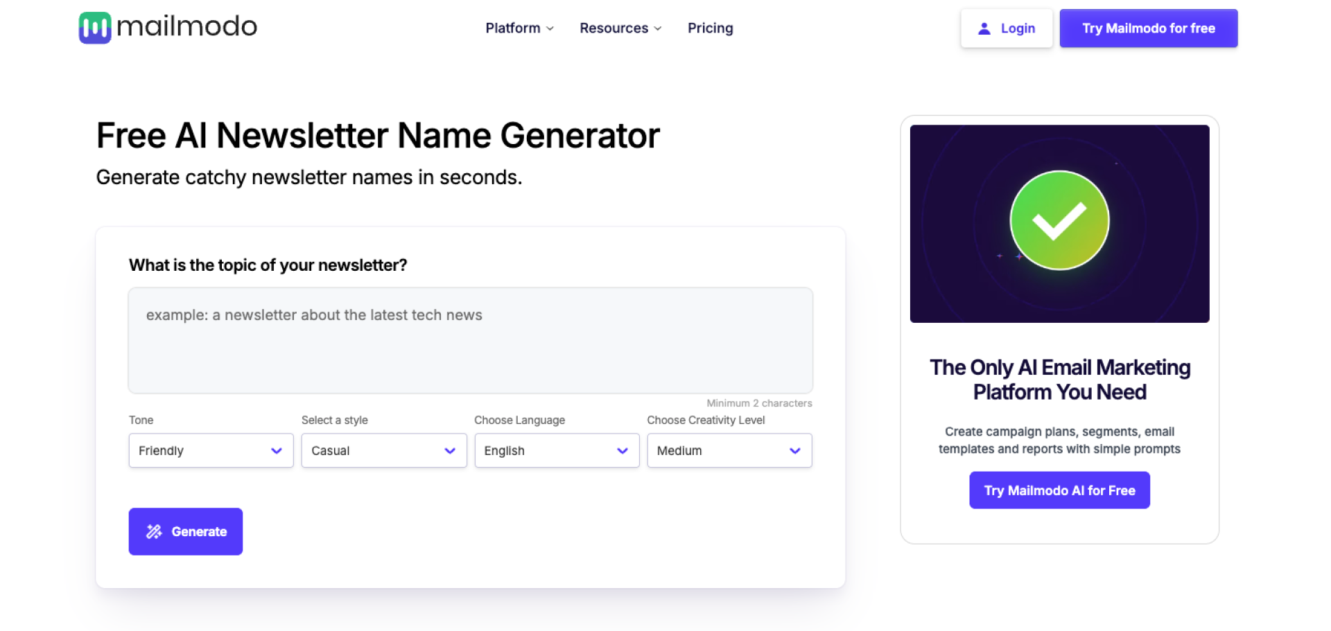 Mailmodo’s Newsletter Name Generator helps you instantly create creative, memorable names for newsletters by turning a simple keyword or theme into a list of engaging suggestions. It removes the brainstorming stress and helps you launch newsletters that resonate with your audience effectively.