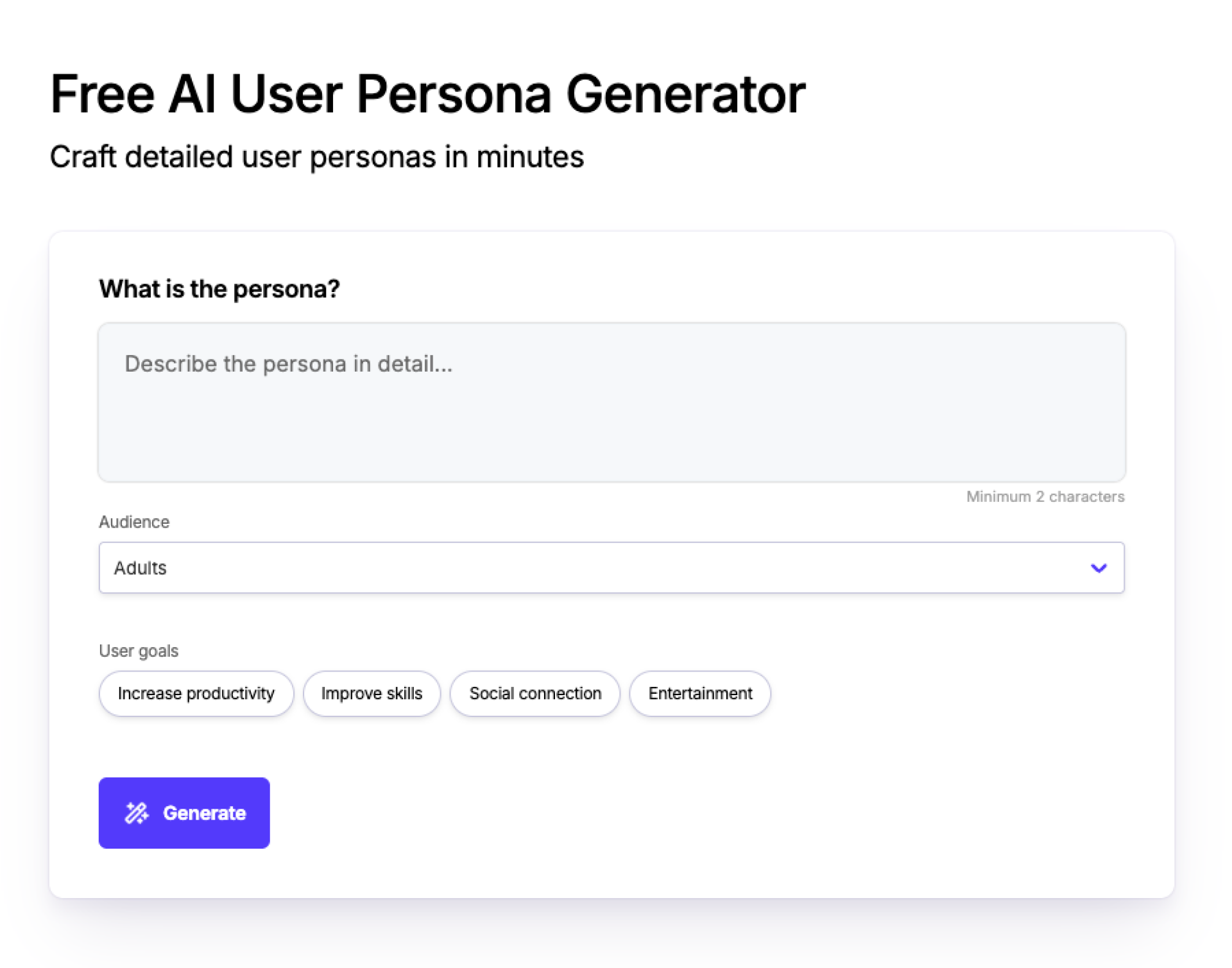 Free AI User Persona Generator can support content creation, research, optimization, and daily operations depending on your workflow.