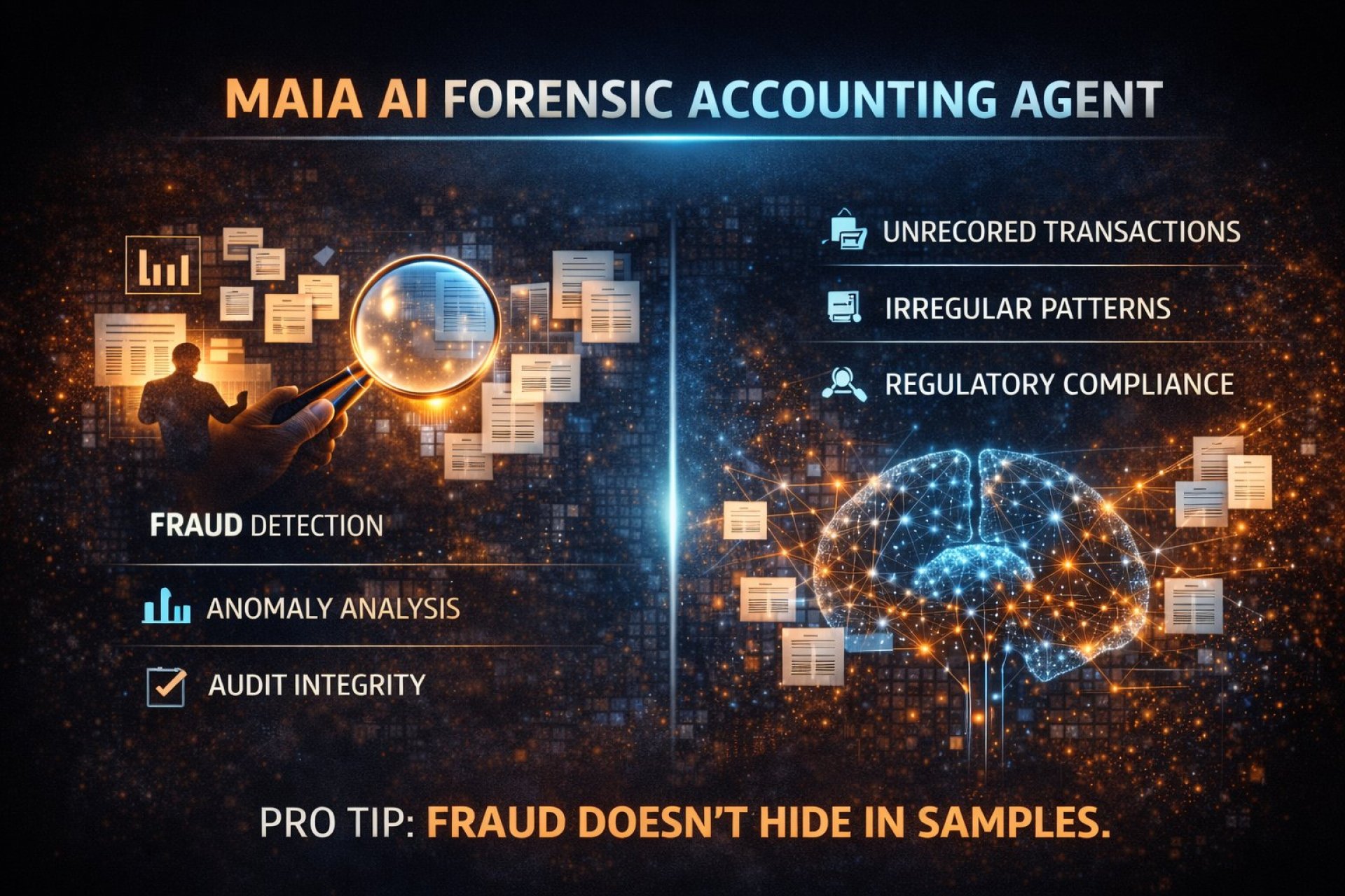 MAIA AI Forensic Accounting Agent is an intelligent system designed to detect financial irregularities, uncover fraud patterns, and analyze complex accounting data with speed and precision. It supports investigators and finance teams by automating audits, risk assessments, and anomaly detection.