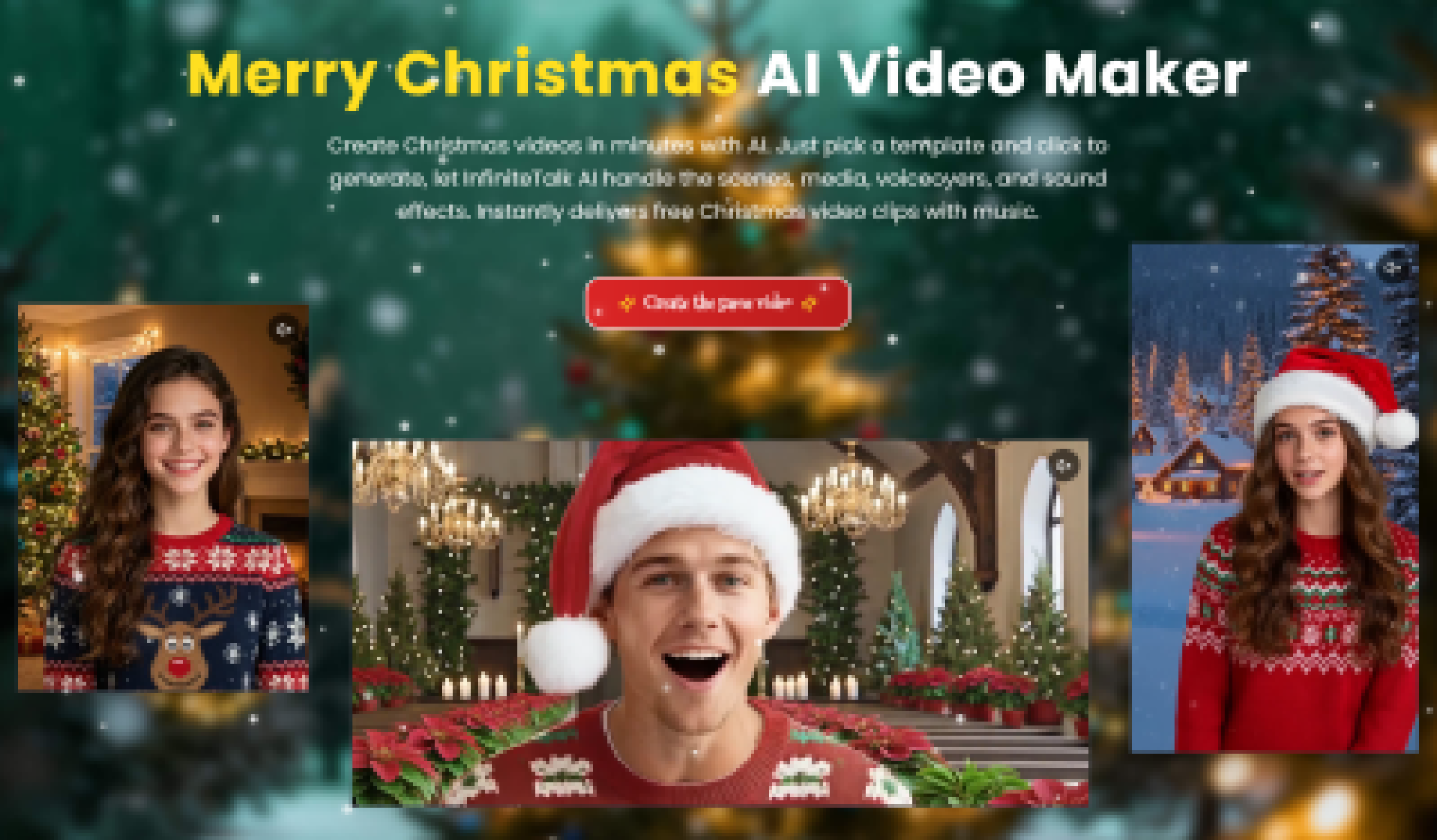 Create Christmas videos in minutes with AI. Just pick a template and click to generate, let InfiniteTalk AI handle the scenes, media, voiceovers, and sound effects. Instantly delivers free Christmas video clips with music.
