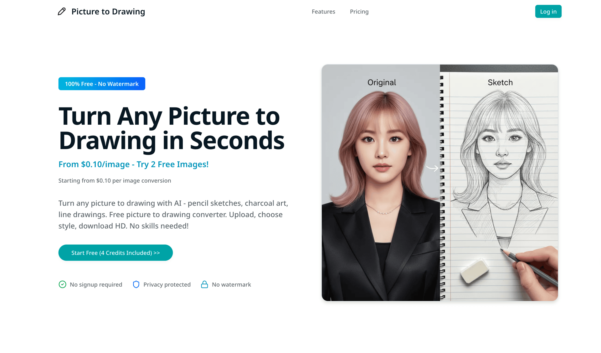 Picture to Drawing - Professional AI Photo to Sketch Converter Picture to Drawing is a powerful AI-driven photo to sketch converter that transforms your pictures into professional-quality artistic drawings in seconds. No drawing skills or complex software required - simply upload your image, choose a style, and download stunning HD sketch art instantly. Core Features:
