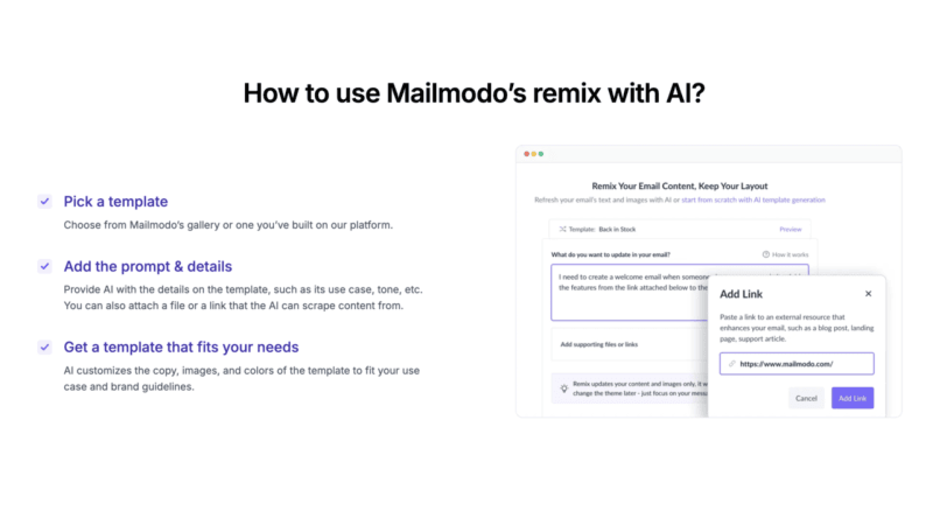 Remix with AI by Mailmodo is a tool that helps marketers refresh and repurpose email templates without starting from scratch. By entering simple prompts, users can update text, adjust layouts, change visuals, and modify colors so each template fits the specific goals of a campaign. This makes it easy to adapt newsletters, promotions, or announcements while keeping brand identity consistent.