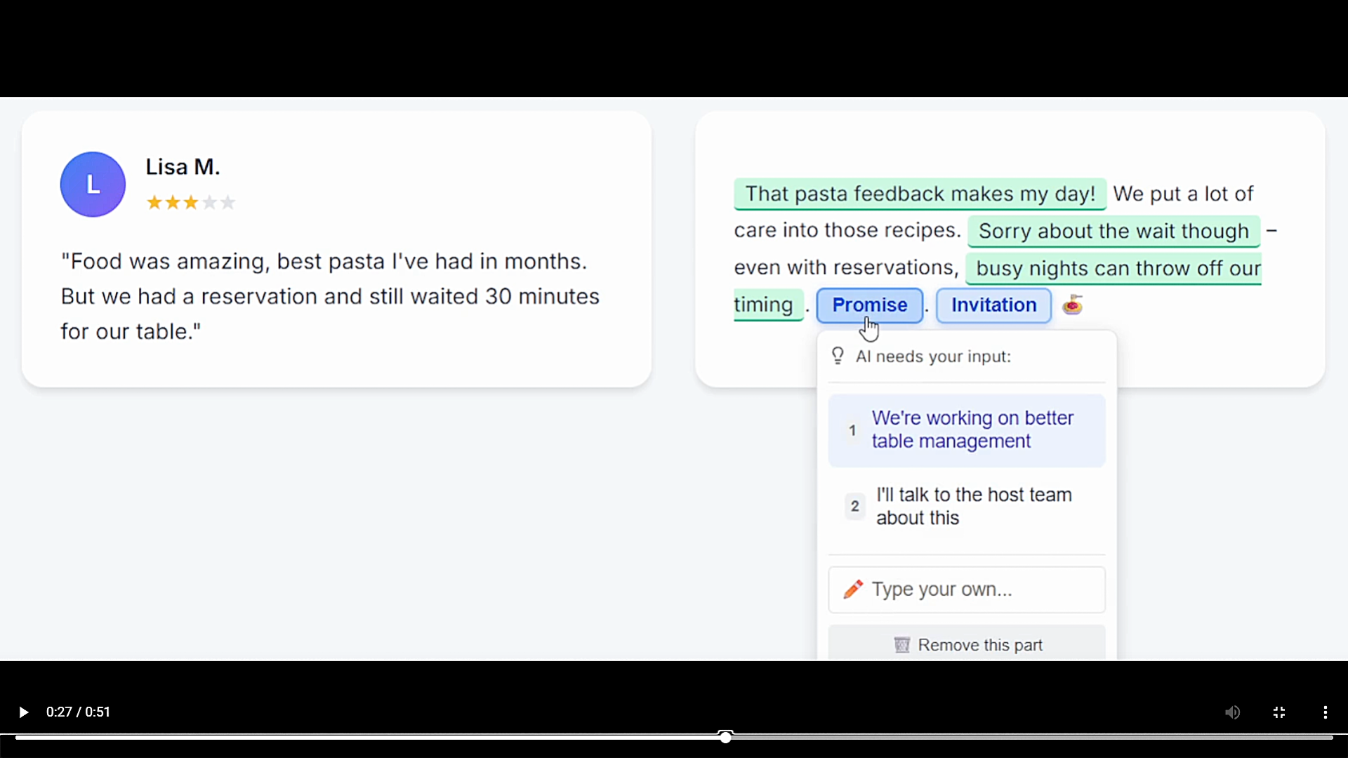 Psychology-based review response tool that writes WITH you, not FOR you. Craft authentic responses to Google, Yelp, TripAdvisor reviews in seconds.