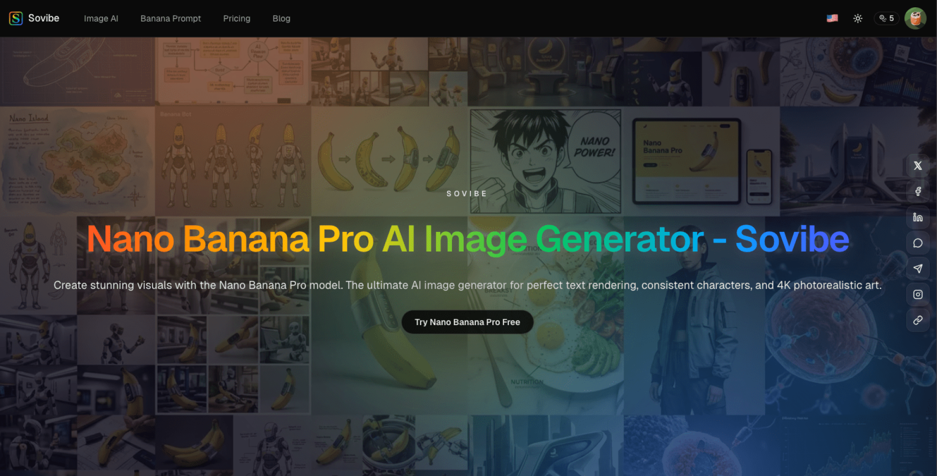 Sovibe is a cutting-edge AI image generator that leverages the advanced Nano Banana Pro architecture to produce stunning visuals, digital art, and realistic photos from simple text prompts.