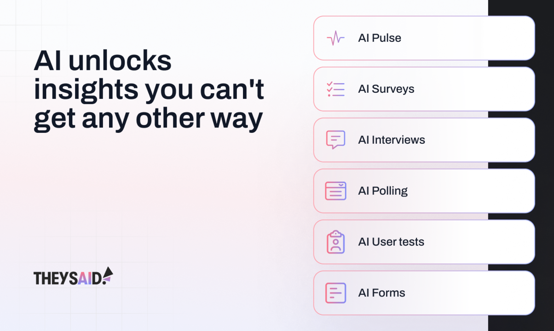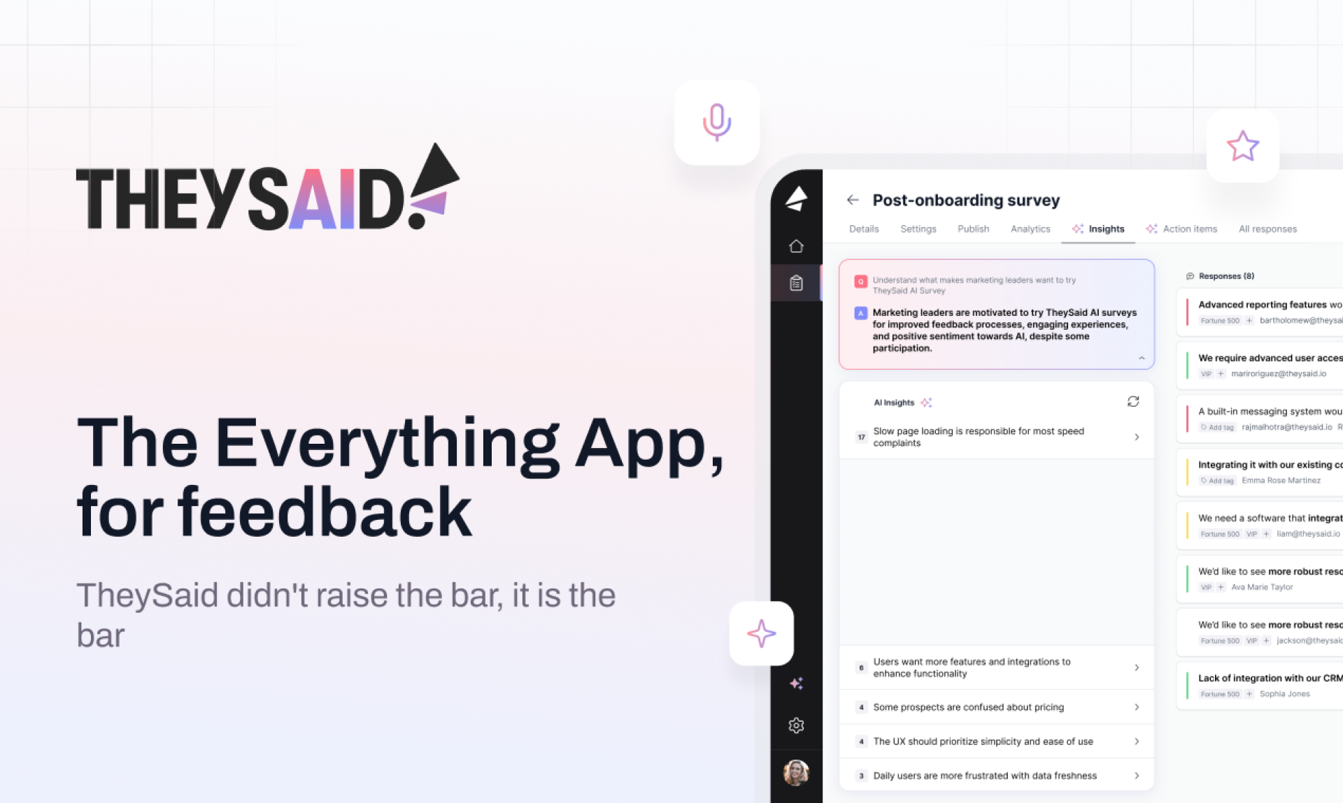 TheySaid - The everything app for feedback, powered by AI and voice to gather, analyze, and act on feedback. Conduct interviews, user tests, surveys, polls, and funnel results into a single dashboard or your database via integrations.