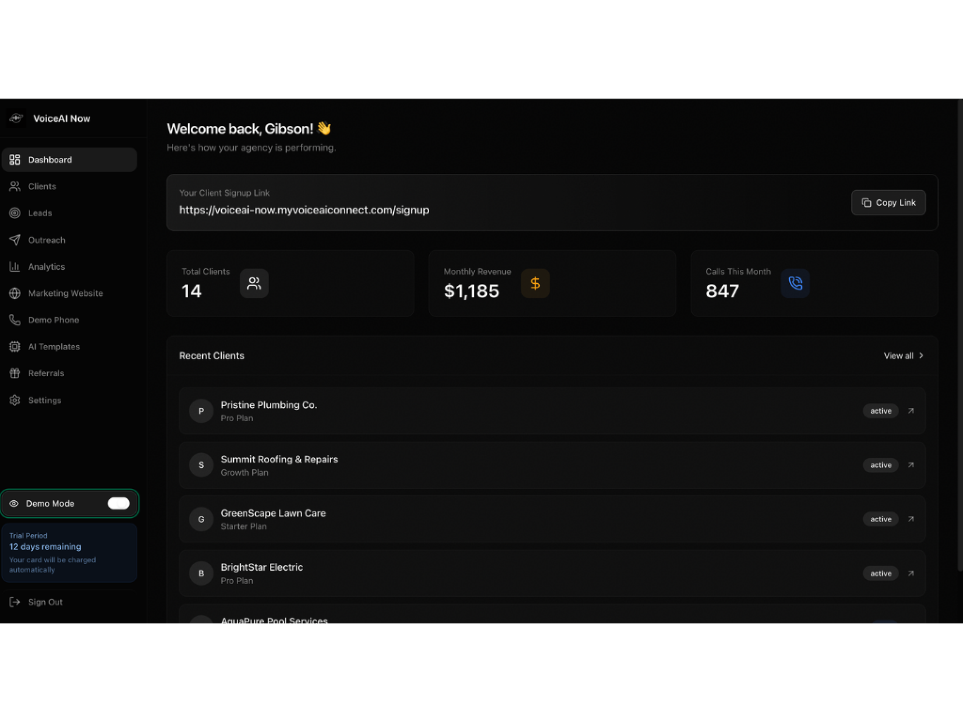 VoiceAI Connect is a white-label platform that lets you start an AI receptionist agency. Sell 24/7 AI phone answering to local businesses under your own brand. You handle sales — the platform handles everything else. Keep 100% of revenue.